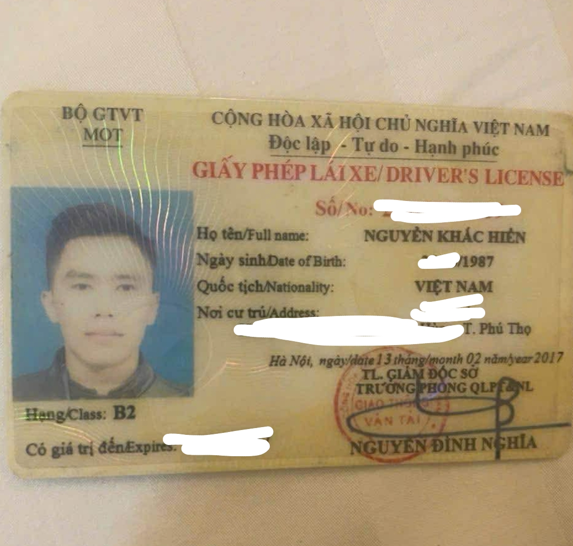 1 bằng lái xe ô tô: mang tên Nguyễn Khắc Hiển